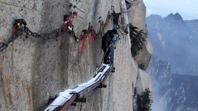 華山長空棧道上“最危險的掃雪人”