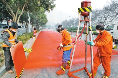“機(jī)動車道6米寬,鋪設(shè)‘綠道’的自行車道也為6米寬。看慣了灰黑色的路面,在看到色彩明銳的‘綠道’后肯定覺得眼前一亮?!G道’只是叫法,并不是說道路外觀一定是綠色的,在景觀設(shè)計中,‘綠道’往往有著更深更廣的內(nèi)涵?!惫こ特?fù)責(zé)人呂先生告訴記者,彩色瀝青厚度僅為1到2毫米,壽命在5年以上,具有警示、防滑、降噪、美觀等特點?!拔覈G道’通常以警示色紅色為主打,主要作用是打造人車分離模式,供騎車者和步行者休閑使用。”